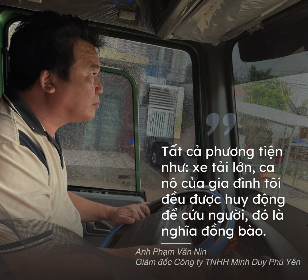 Giữa những gương mặt nghĩa hiệp trong ngày lũ dữ, anh Phạm Văn Nin, Giám đốc Công ty TNHH Minh Duy Phú Yên, trở thành hình ảnh quen thuộc tại hầu hết các điểm nóng, nơi cần sự có mặt kịp thời để cứu người. Ngay khi nước bắt đầu dâng cao, anh Nin huy động toàn bộ phương tiện của công ty - từ ca nô, xe tải lớn đến các thiết bị hỗ trợ - để tham gia cứu nạn. Có lúc, anh trực tiếp lái ca nô luồn vào từng cụm dân cư bị cô lập, nơi chỉ còn nhìn thấy lờ mờ những mái tôn giữa làn nước xám ngầu. Có khi, anh một mình điều khiển xe tải cỡ lớn vượt qua những tuyến đường biến thành sông, đưa lực lượng cứu hộ áp sát hơn với những điểm đang cần sơ tán gấp. Anh có mặt ở bất cứ nơi nào vừa mới phát đi lời cầu cứu.