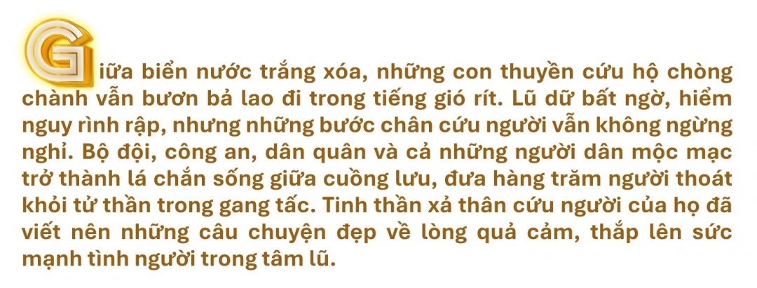 Mỗi hành động cứu người là một nhịp cầu nối hy vọng, một lời nhắc rằng không ai bị bỏ lại phía sau. Giữa biển nước mênh mông, tinh thần quả cảm và nghĩa tình của các lực lượng cứu hộ, cán bộ và người dân trở thành ánh sáng dẫn đường, thắp lên niềm tin rằng dù thiên tai có khắc nghiệt đến đâu, con người vẫn luôn kề vai sát cánh để giữ lấy sự sống và bình yên.