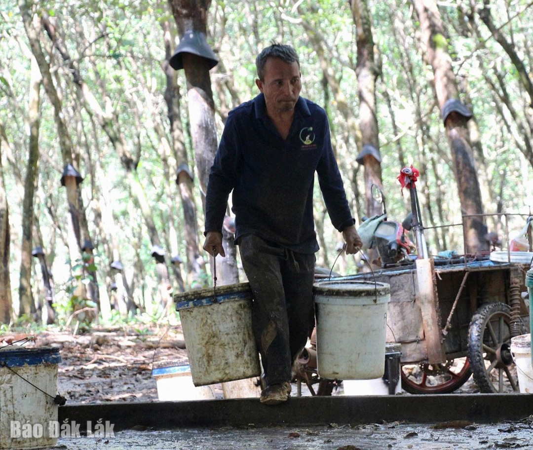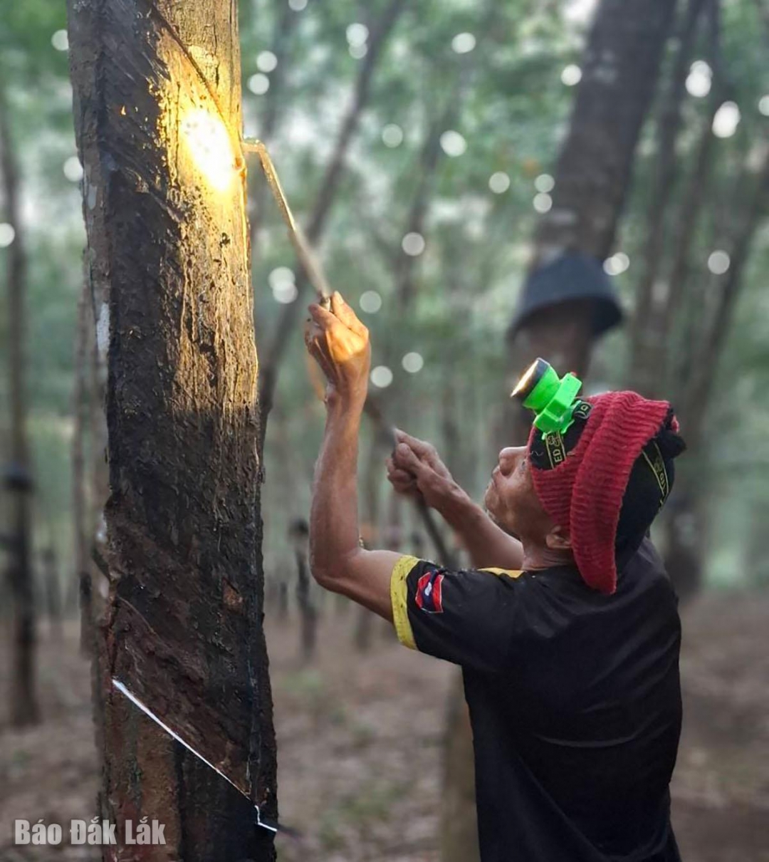 | Cạo mủ là công việc vất vả, nhưng mang lại thu nhập khá cho lao động địa phương. |