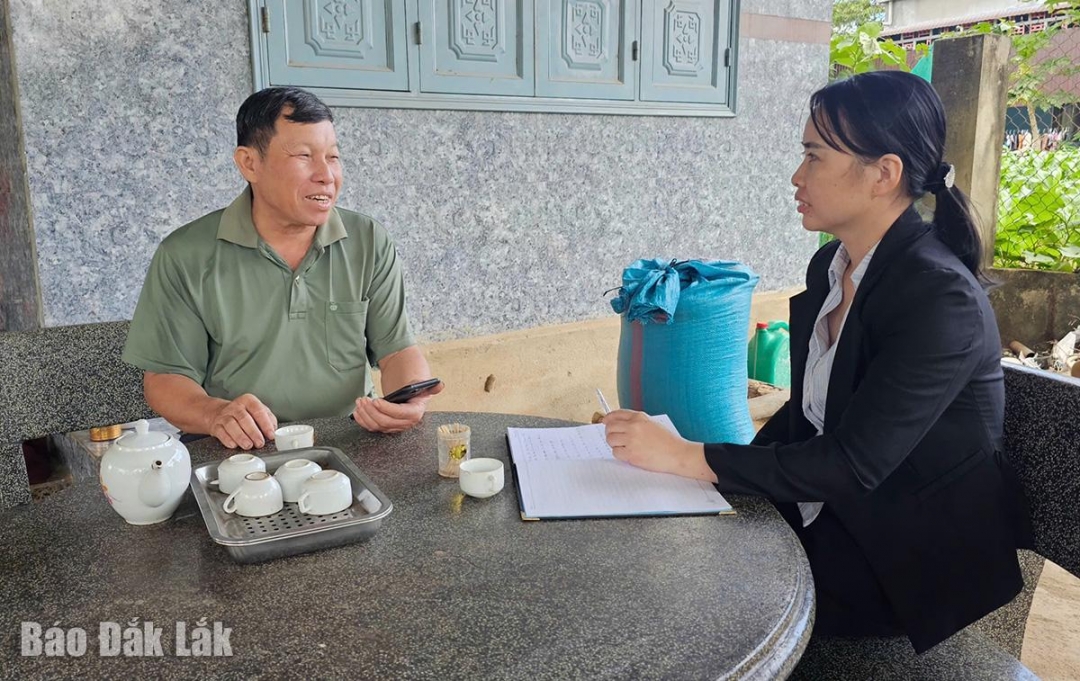 | Ông Hà Đình Xuân trao đổi với cán bộ xã Ea Bung về các hình thức tuyên truyền pháp luật cho người dân. |