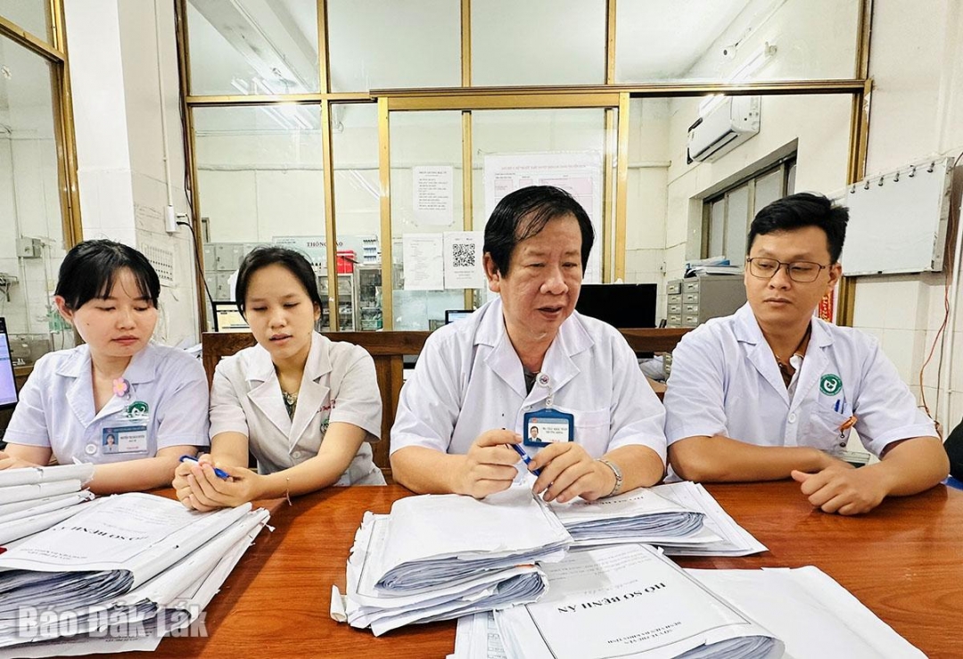Thầy thuốc Ưu tú, bác sĩ CKII Châu Khắc Toàn (thứ hai từ phải sang) trao đổi chuyên môn với các bác sĩ trẻ. |