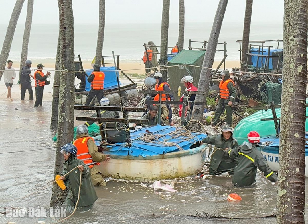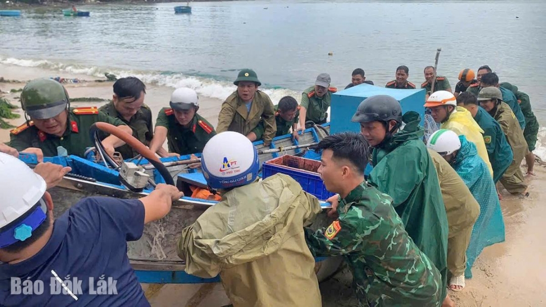 | Cán bộ, chiến sĩ, dân quân tự vệ phường Sông Cầu giúp người dân chằng chống, lai dắt, di chuyển phương tiện vào bờ |