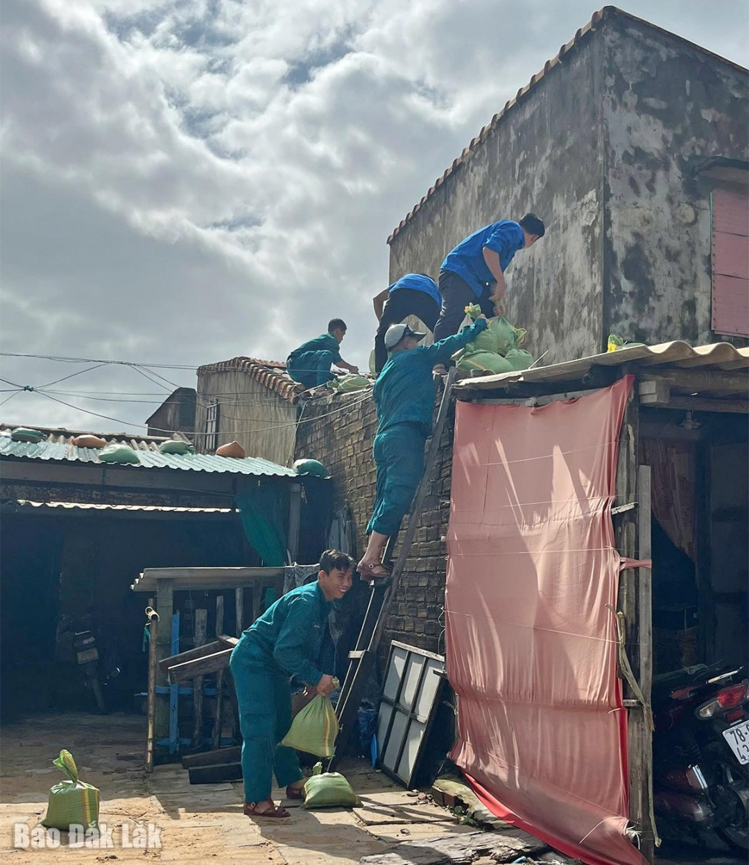 | Lực lượng dân quân tự vệ gia cố nhà cho dân. |