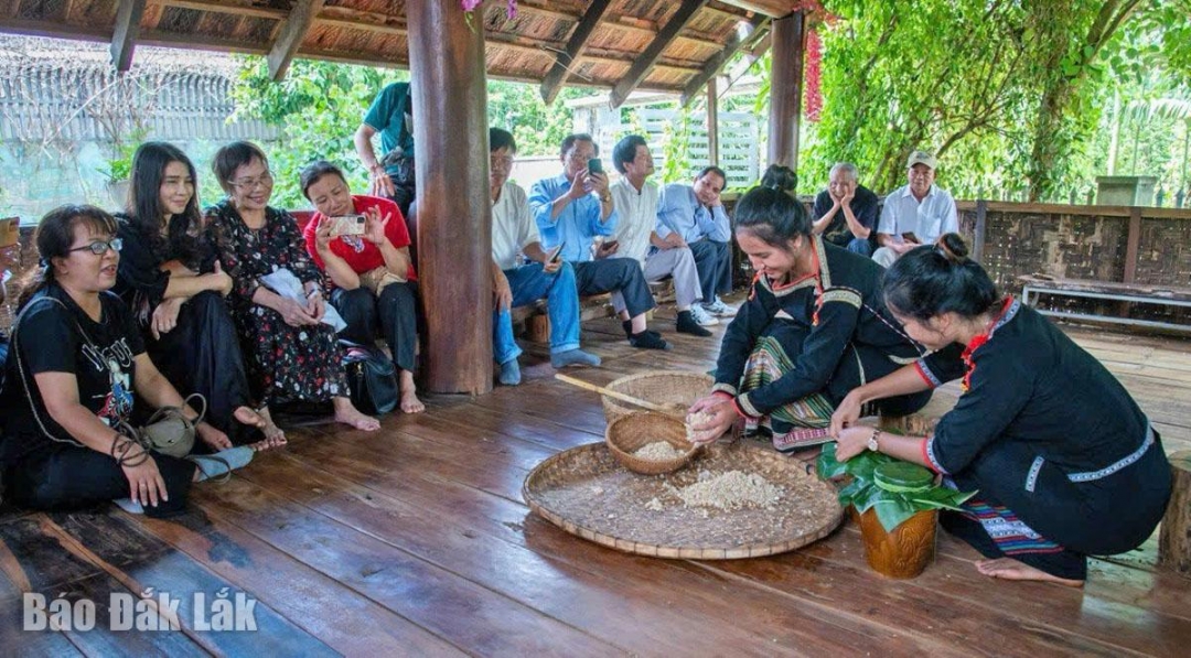 | Du khách tìm hiểu về chế biến rượu cần của đồng bào Êđê. Ảnh: Hữu Hùng |