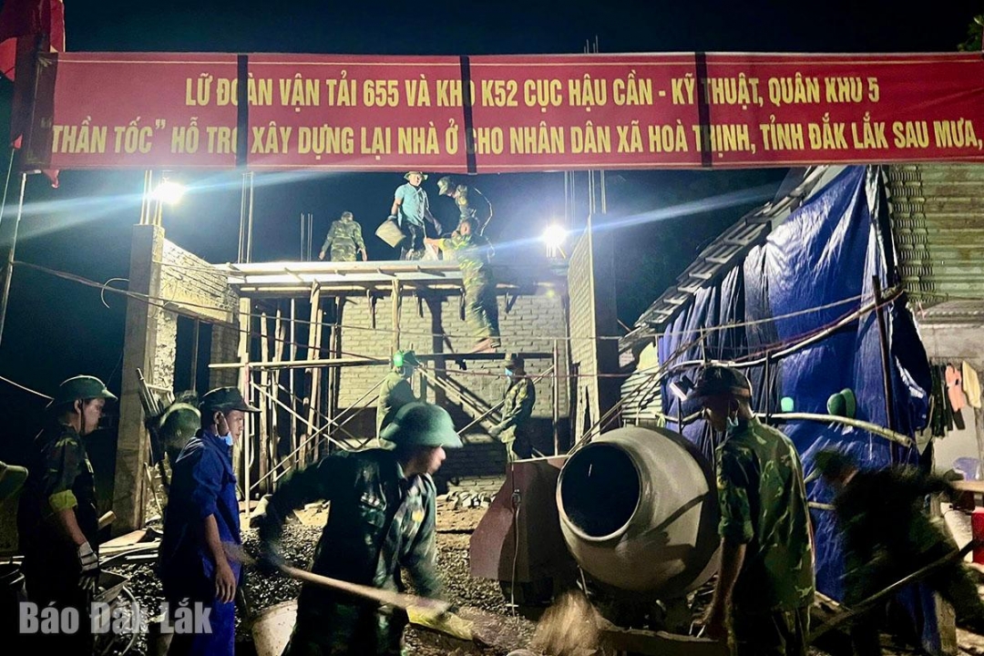 | Tính đến ngày 17/12, Đắk Lắk đã khởi công hơn 400/650 nhà. Trong đợt 1, Quân khu 5 huy động hơn 2.700 cán bộ, chiến sĩ tham gia; Bộ Quốc phòng huy động 183 đội với gần 1.550 cán bộ, chiến sĩ… Nhiều địa phương tiếp tục tăng cường lực lượng đợt 2 để hoàn thành việc xây nhà sớm hơn kế hoạch, đẩy mạnh tiến độ sửa chữa nhà hư hỏng để bảo đảm người dân có chỗ ở, sinh hoạt trước Tết Nguyên đán. |