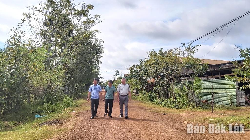 | Trưởng thôn 19 Ea Rốk, xã Ea Rốk Lang Thị Oanh (bìa phải) khảo sát tình hình bảo quản, sử dụng bồn nước được cấp của hộ dân trong thôn. |
