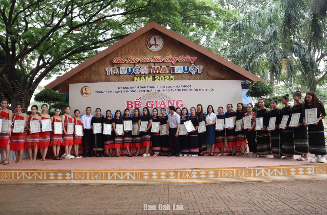 | Lãnh đạo TP. Buôn Ma Thuột và Trung tâm Truyền thông - Văn hóa - Thể thao trao giấy khen cho các học viên. |
