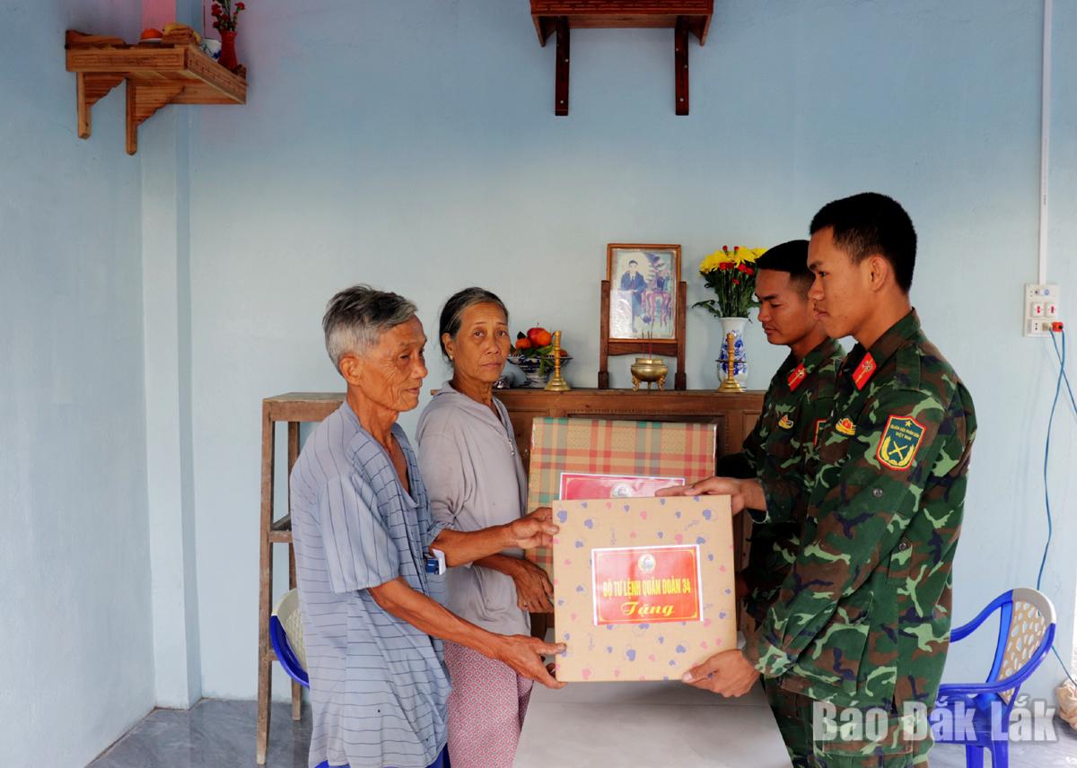 | Chiến sĩ Sư đoàn 10, Quân đoàn 34 tặng quà cho vợ chồng ông Nguyễn Trọng Phê ngày gia đình ông về nhà mới. |
