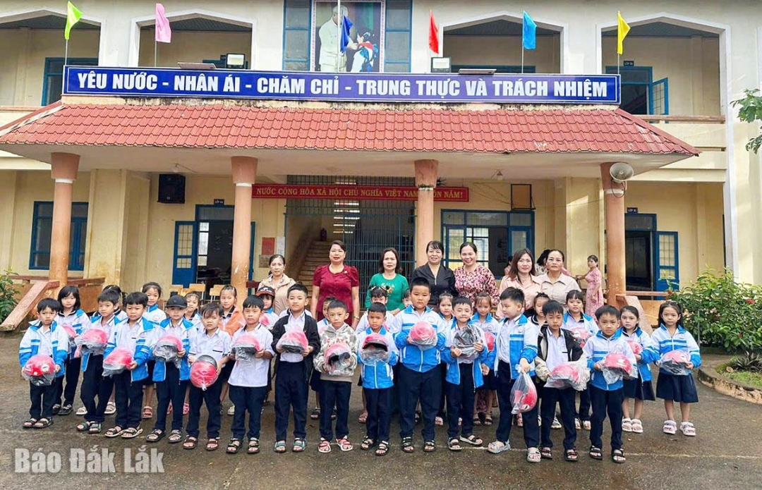 Học sinh Trường Tiểu học Krông Búk (xã Ea Kly) nhận mũ bảo hiểm đầu năm học 2025 - 2026. |