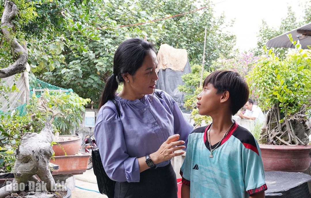 | Cô Mai Thị Xuân Hạnh - giáo viên phụ trách phổ cập giáo dục của Trường THCS Châu Kim Huệ thường xuyên gặp gỡ, khuyên nhủ các em cố gắng học hành để tạo lập tương lai. Trong ảnh: Cô Hạnh trò chuyện với một trong số những học trò đã được cô đưa trở lại trường trong năm học vừa qua. |