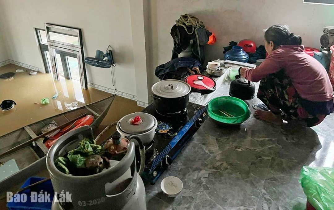 | Người vùng lũ nấu ăn trên gác xép. |