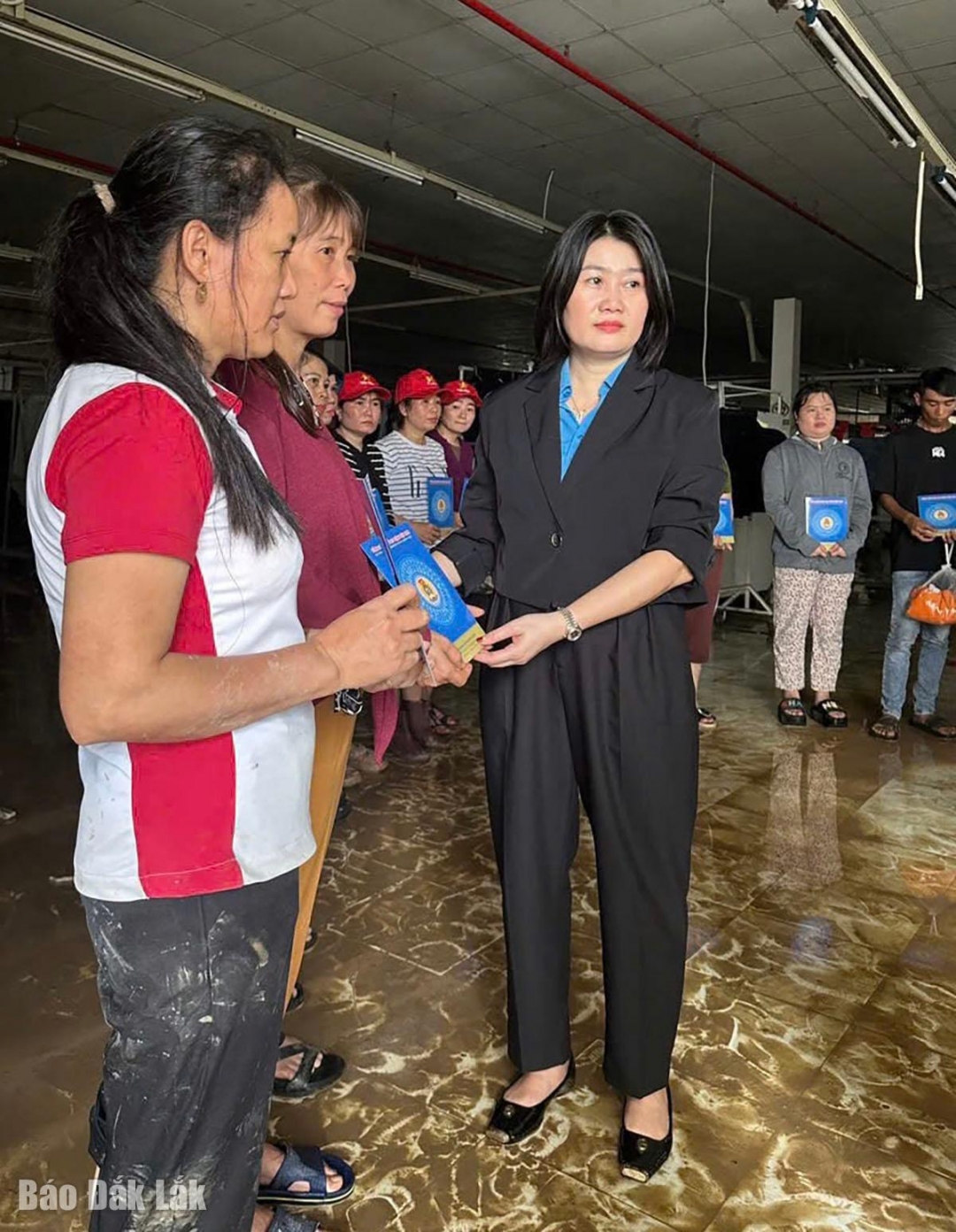 | Liên đoàn Lao động tỉnh trao quà hỗ trợ người lao động khắc phục hậu quả bão lụt. |