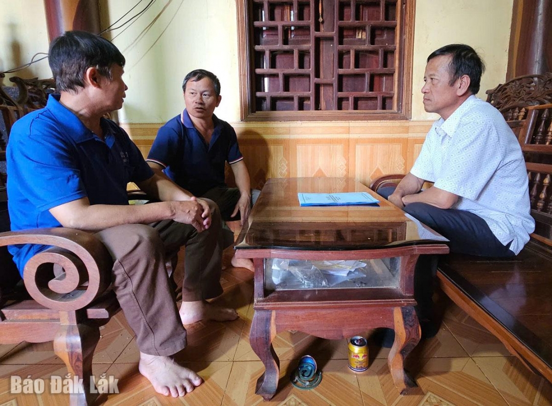 | Ông Ngân Hoài Lu (bìa phải) trao đổi với người dân về việc chủ động bảo vệ nông sản trong mùa thu hoạch cà phê. |