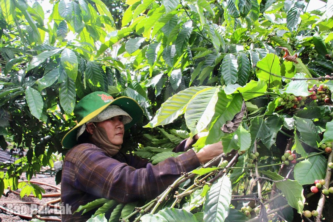| Chị H’Lim Ayun thu hoạch cà phê. |