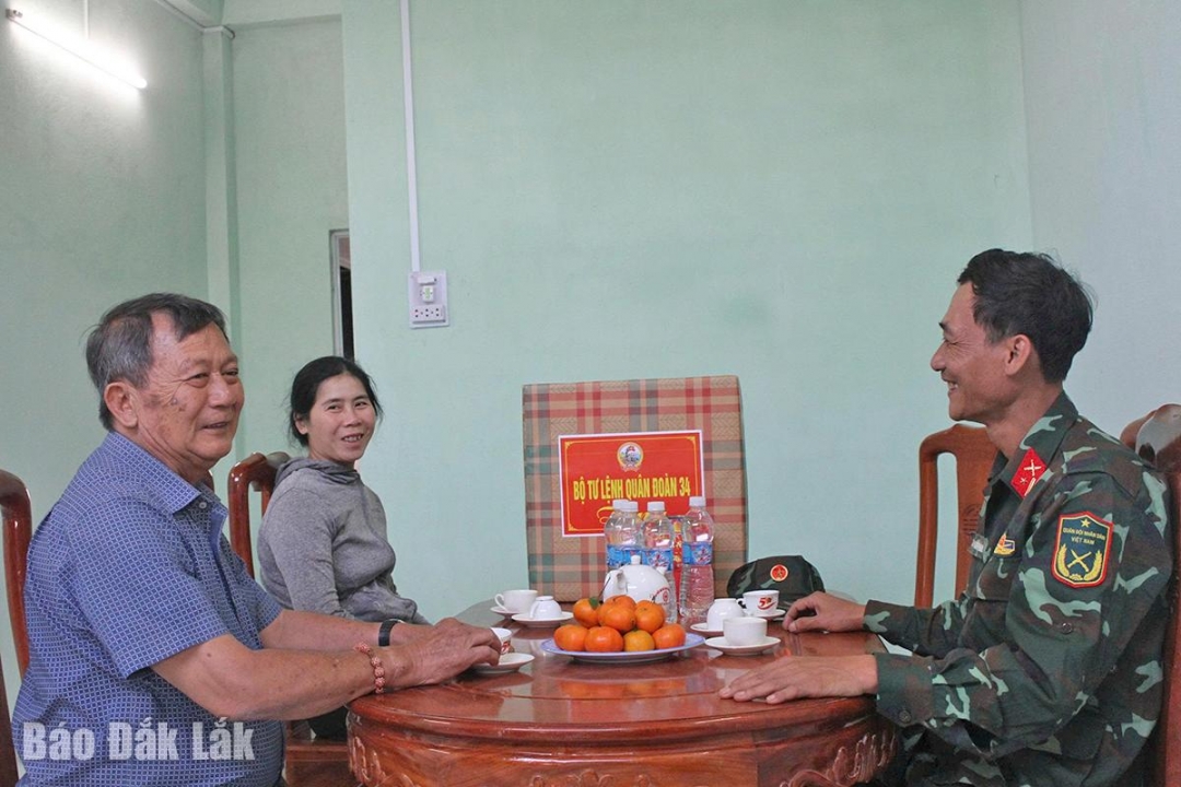 | Chiến sĩ Sư đoàn 10 thăm, chúc mừng một hộ dân ở xã Sơn Hòa được hỗ trợ xây dựng nhà trong Chiến dịch Quang Trung. Ảnh: Tuyết Hương |