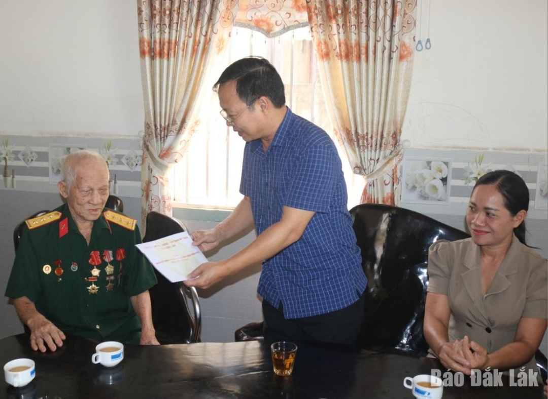 | Thượng tá Nguyễn Cao Quyết, Trưởng Công an huyện Cư Kuin, Phó trưởng Ban tổ chức hội thi trao giải Nhất cho đội thi xã Ea Bhốk. |