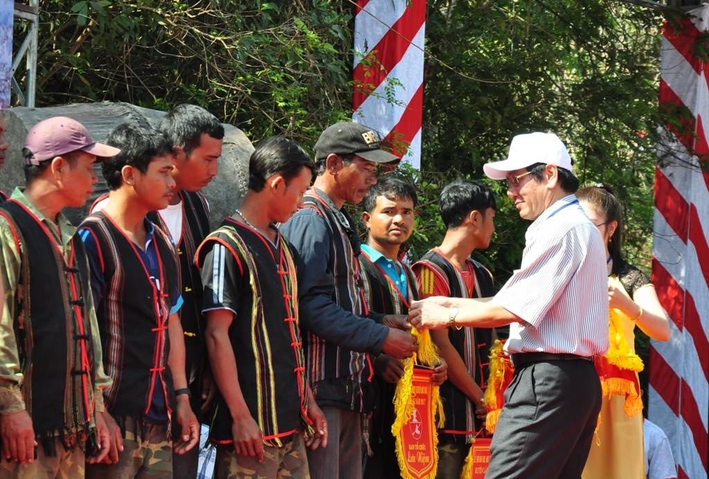 | Ban tổ chức trao cờ lưu niệm tặng các nài voi, chủ thuyền tham dự lễ hội |