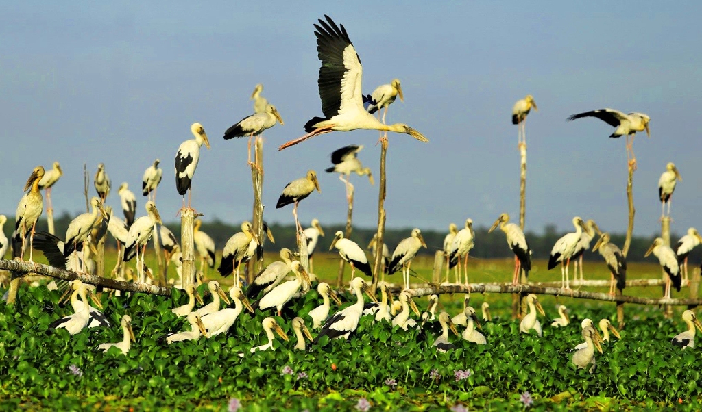 Những đám lau sậy xanh tốt cao quá đầu người, những đám bèo, lục bình mướt mát dập dờn trôi theo sóng nước cũng góp phần tô điểm bức tranh thiên nhiên đa màu, đa sắc nơi đây. Du khách không khỏi thích thú khi thấy những đàn cá quẫy đuôi, tung tăng bơi lội bên mạn thuyền, say mê ngắm nhìn những đàn bồ nông, đàn diệc và hàng nghìn con cò trắng phau chao mình bay lượn.