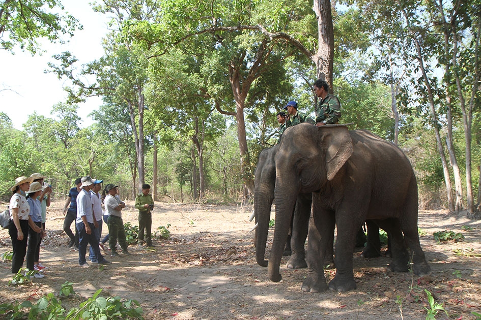| Du khách tham gia học làm quản tượng, một sản phẩm du lịch thân thiện với Voi của Vườn Quốc gia Yok Đôn. |