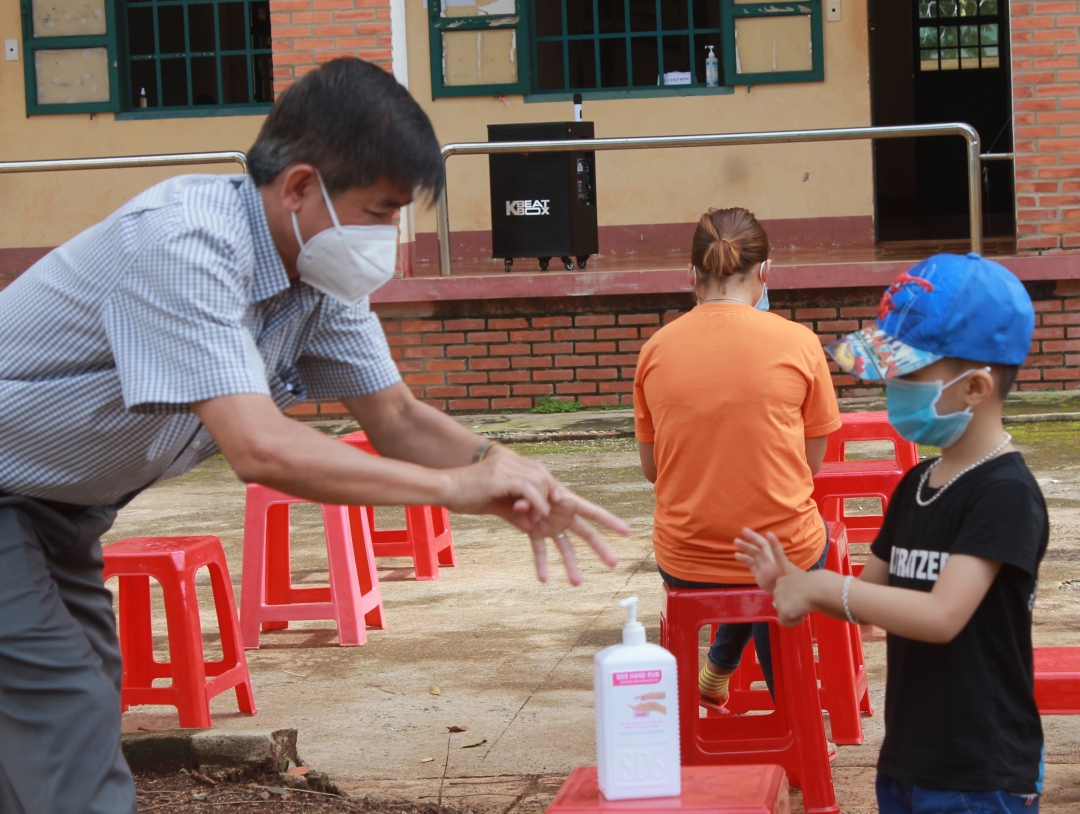 | Sử dụng dung dịch sát khuẩn trở thành thói quen của những em bé trong suốt thời gian cách ly tại Trung đoàn Cảnh sát cơ động Tây Nguyên. |