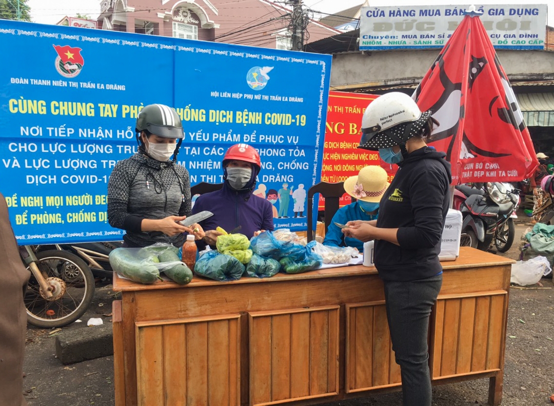 Chị Nguyễn Thụy Vân Anh, Chủ tịch Hội LHPN thị trấn Ea Drăng cho biết, Hội có 1.189 hội viên tham gia sinh hoạt ở 18 chi hội, nên mỗi chi hội phụ trách nấu ăn một ngày. Ngoài sự đóng góp của hội viên, đoàn viên, thanh niên, Hội LHPN thị trấn phối hợp với Đoàn Thanh niên địa phương thiết lập địa điểm tiếp nhận hỗ trợ nhu yếu phẩm để phục vụ nấu ăn và phát miễn phí tại chợ Ea Drăng. Nhiều cá nhân, tổ chức hảo tâm đã trực tiếp đến điểm tiếp nhận hỗ trợ.