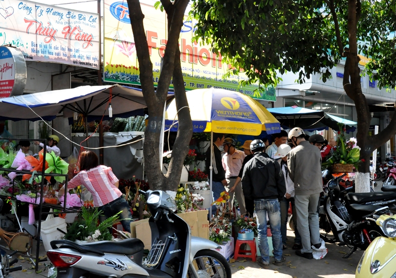 | Dọc tuyến đường Lê Duẩn cũng nườm nượp người mua hoa |