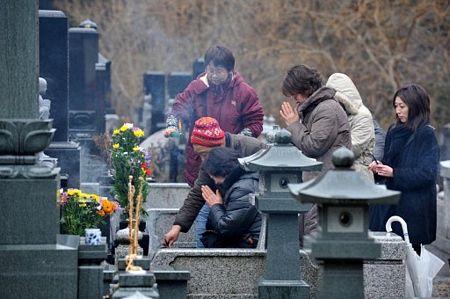 | Mọi người đặt hoa và cầu nguyện trước ngôi một của một nạn nhân chết vì thảm hoạ kinh hoàng tại Minamisanriku, tỉnh Miyagi |