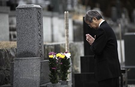 | Một người đàn ông đặt hoa và chắp tay cầu nguyện trước mộ của người thân tại Ofunato, tỉnh Iwate |