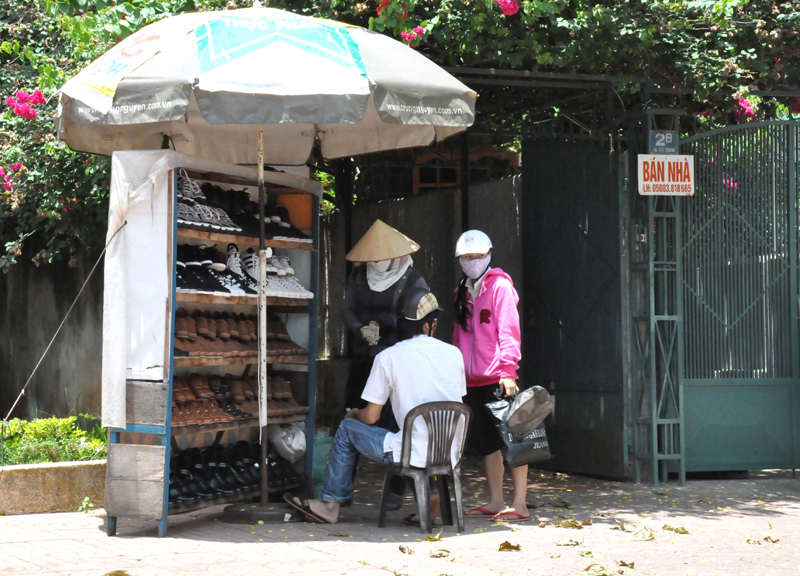 | Người bán lẫn người mua đều che kín mặt để tránh nắng |