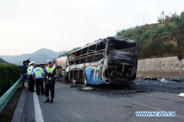 Theo Tân Hoa xã, chiếc xe buýt chở 39 người đã bùng cháy sau vụ va chạm tại thành phố Diên An sáng 26-8. Chiếc xe bồn cũng bị cháy rụi.