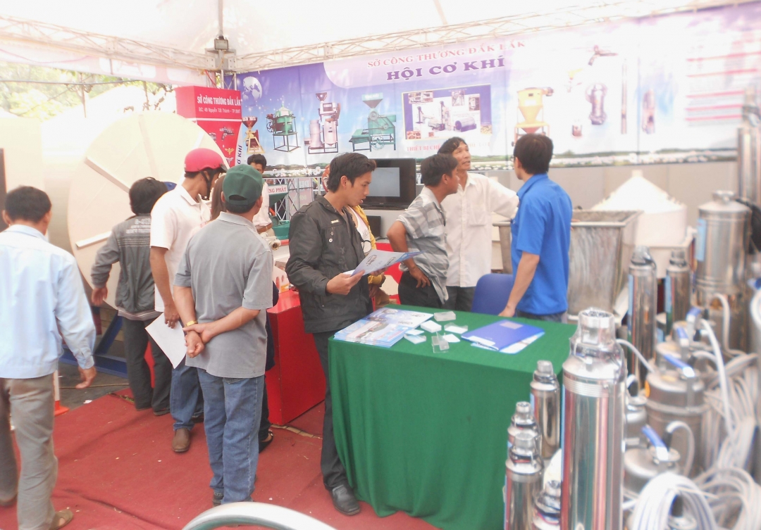 | Nghe giới thiệu về các sản phẩm cơ khí phục vụ chế biến sau thu hoạch, đặc biệt là các loại máy bơm tưới cà phê phù hợp với các loại địa hình đồi dốc |