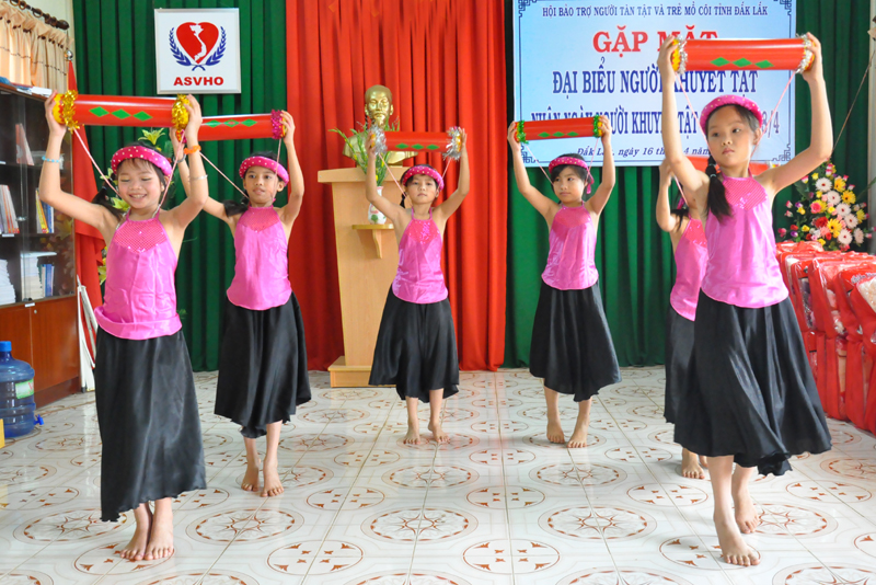| Một tiết mục văn nghệ chào mừng buổi gặp mặt do các cháu thiếu nhi thuộc Trung tâm Bảo trợ Xã hội tỉnh biểu diễn |