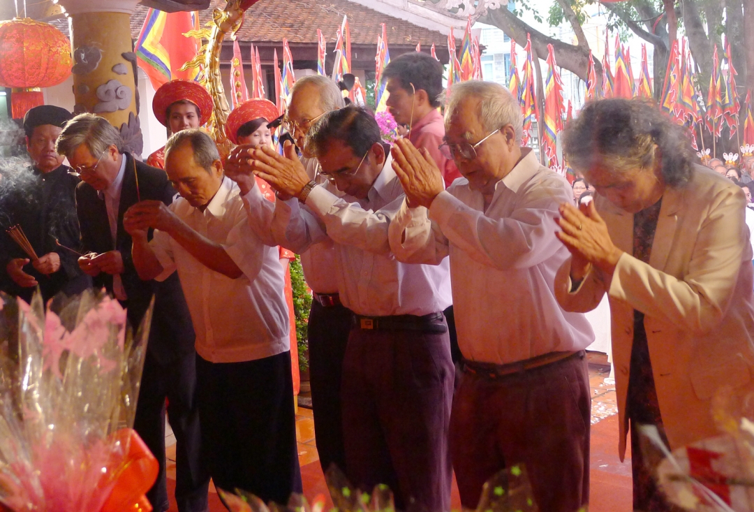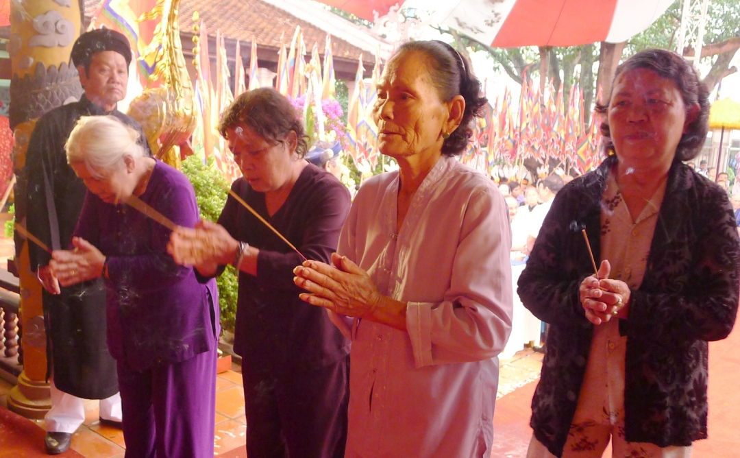 Với lòng thành kính, tri ân công đức các Vua Hùng, các đại biểu cùng đông đảo nhân dân đã dâng hương, hoa, bánh chưng, bánh dày, trầu cau, xôi, heo quay và các lễ vật khác ... lên điện thờ tri ân công đức tổ tiên, làm lễ bái vọng, tưởng nhớ Quốc Tổ Hùng Vương.
