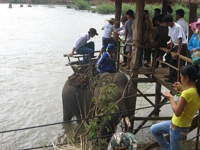Đông đảo du khách chờ tới lượt để được cưỡi voi vượt sông Sêrêpôk tại Trung tâm du lịch Buôn Đôn |