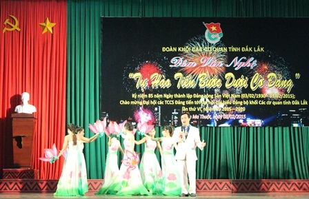 Nhân kỷ niệm 85 năm Ngày thành lập Đảng cộng sản Việt Nam; chào mừng Đại hội các tổ chức cơ sở Đảng tiến tới Đại hội đại biểu Đảng bộ Khối các cơ quan tỉnh lần thứ VI, nhiệm kỳ 2015-2020, tối 3-2, tại Nhà Văn hóa Thanh thiếu nhi, Ban Thường vụ Đoàn Khối các cơ quan tỉnh tổ chức đêm văn nghệ với chủ đề “Tự hào tiến bước dưới cờ Đảng”.