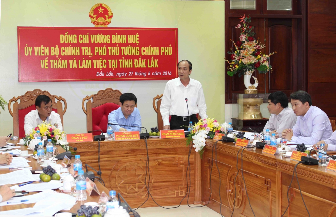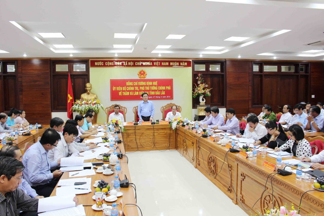 Chiều 27-5, Đoàn công tác của Chính phủ do Ủy viên Bộ Chính trị, Phó Thủ tướng Chính phủ Vương Đình Huệ làm Trưởng đoàn đã có buổi làm việc với tỉnh Đắk Lắk về việc triển khai thực hiện các Nghị quyết số 01, 19, 35 của Chính phủ; công tác xây dựng nông thôn mới; tình hình phát triển kinh tế - xã hội 5 tháng đầu năm và kế hoạch triển khai nhiệm vụ những tháng cuối năm 2016. Tiếp và làm việc với Đoàn có Bí thư Tỉnh ủy Êban Y Phu; Phó Bí thư Thường trực Tỉnh ủy Phạm Minh Tấn; Phó Bí thư, Chủ tịch UBND tỉnh Phạm Ngọc Nghị; Ban Thường vụ Tỉnh ủy; cùng lãnh đạo các sở, ngành địa phương.