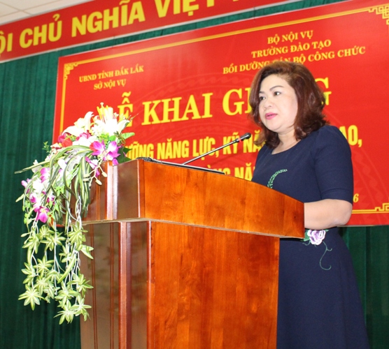 | Phó Giám đốc Sở Nội vụ H' Yâo Knul phát biểu tại lễ khai giảng |