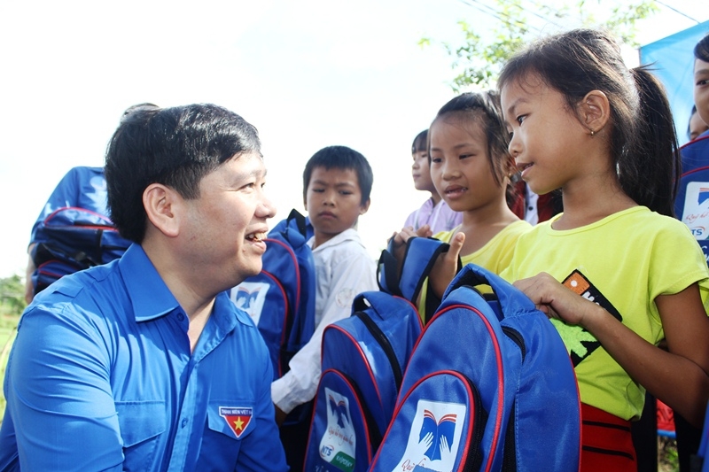 | Bí thư Trung ương Đoàn TNCS Hồ Chí Minh, Chủ tịch Hội Đồng đội Trung ương Nguyễn Long Hải tặng quà cho các em thiếu nhi huyện Buôn Đôn. |
