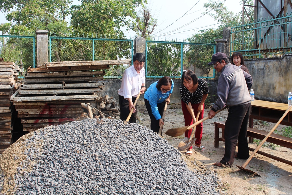 | Đoàn viên thanh niên thực hiện công trình bê tông hóa sân bóng chuyền |