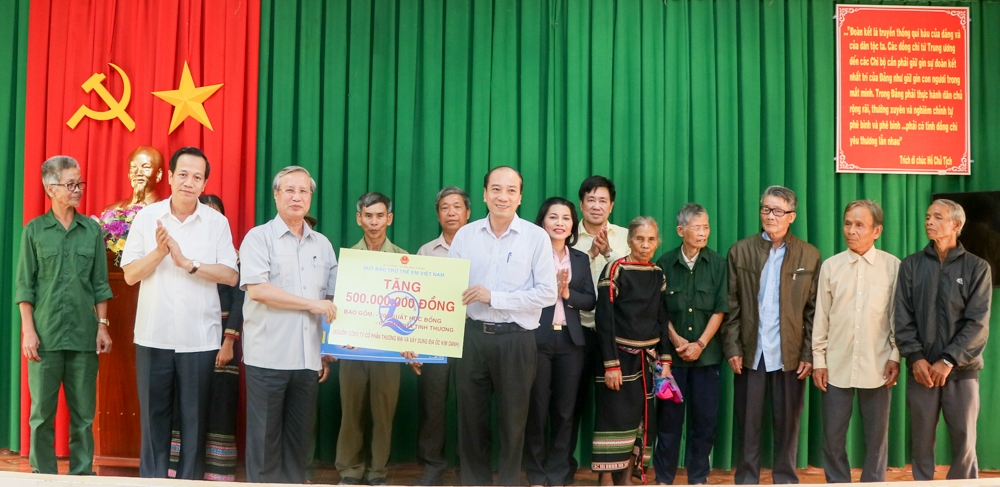 | Đồng chí Trần Quốc Vượng trao kinh phí hỗ trợ xây dựng nhà Tình thương và tặng học bổng cho trẻ em vượt khó của huyện Cư M’gar. Ảnh: N.Gia |