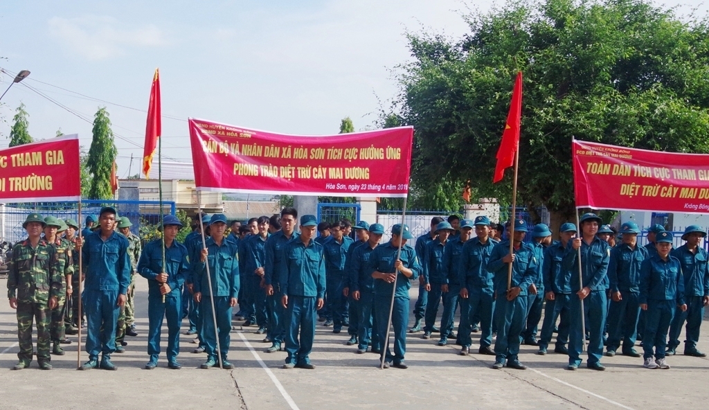 | Cán bộ, chiến sĩ lực lượng vũ trang huyện tham gia diệt trừ cây mai dương trên địa bàn xã Hòa Sơn |