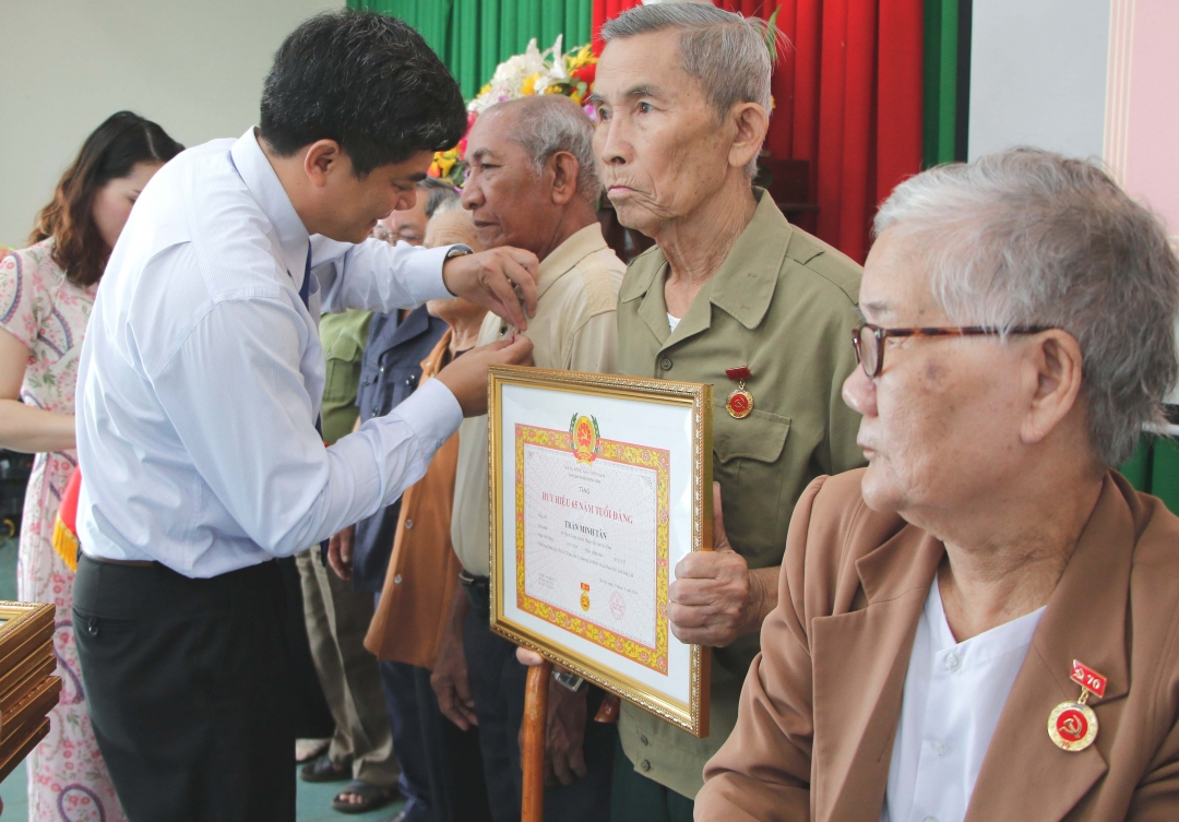 | Phó Bí thư Thường trực Tỉnh ủy Phạm Minh Tấn tặng quà các đại biểu tham dự liên hoan |