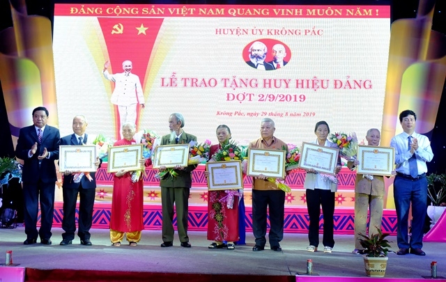 | Lãnh đạo Huyện ủy Krông Pắc trao Huy hiệu Đảng cho các đảng viên. |