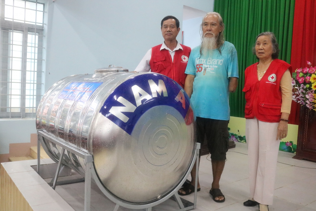 | Đại diện Cụm thi đua số 3 thuộc Hội Chữ thập đỏ TP. Hồ Chí Minh tặng bồn chứa nước cho người dân xã Yang Reh. |