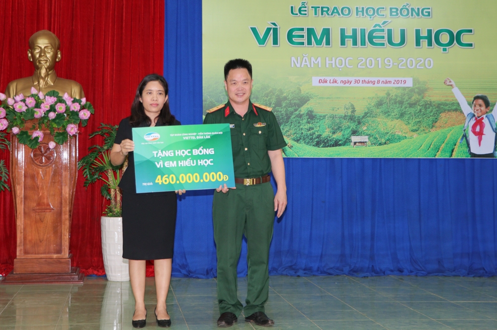 | Đại diện Viettel Đắk Lắk và Phòng Giáo dục - Đào tạo huyện Ea Kar trao học bổng tặng các em học sinh. |