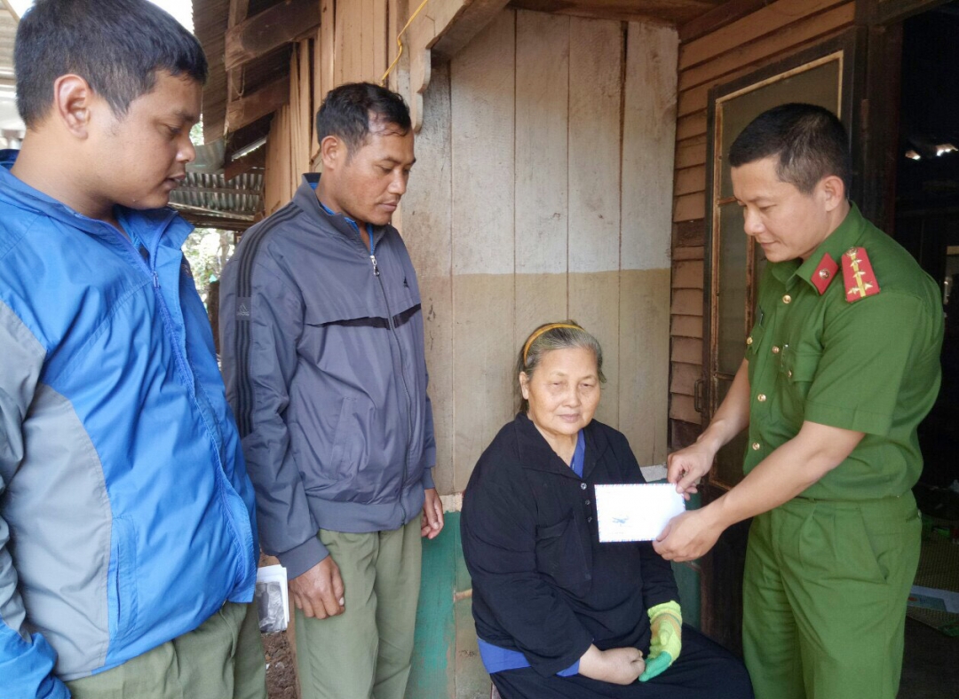 | Cán bộ Đội Cảnh sát Quản lý hành chính về trật tự xã hội tặng quà cho người dân già yếu được cấp CMND tại nhà. |