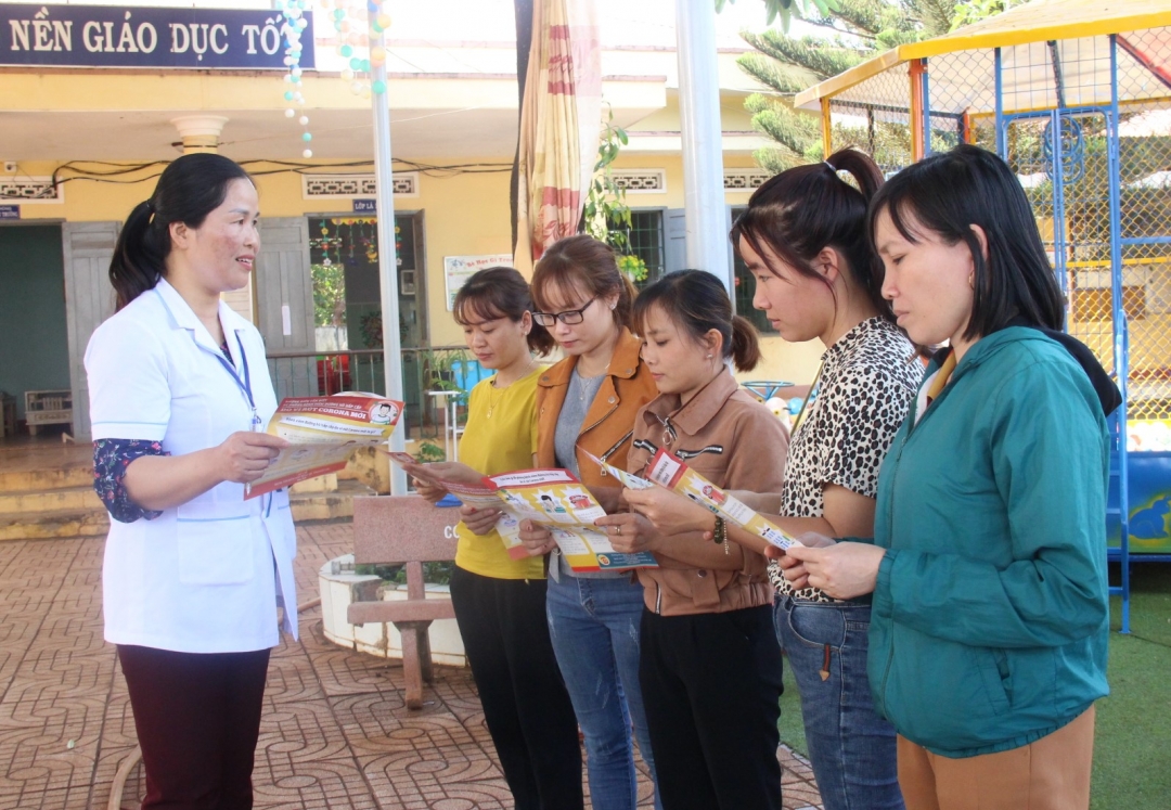 | Giám đốc Sở Y tế Nay Phi La hướng dẫn giáo viên các biện pháp phòng chống bệnh Covid-19 trong trường học. |