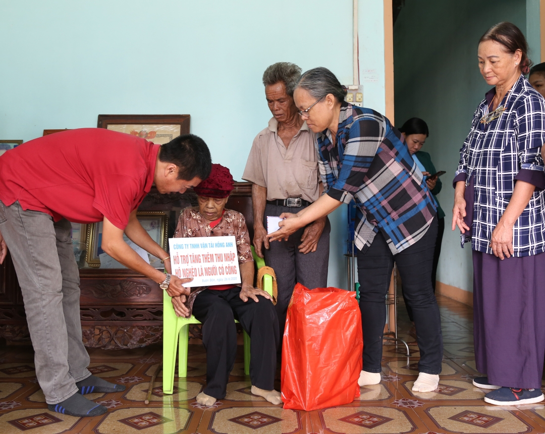 Các đối tượng nhận hỗ trợ đợt này gồm: ông Phạm Văn Trợ (SN 1955, trú thôn Hòa An, xã Ea Nuôl, huyện Buôn Đôn) - gia đình có công với cách mạng, bản thân ông bị nhiễm chất độc hóa học, người già neo đơn; bà Đỗ Thị Hồng Châu (SN 1928, trú thôn 16, xã Ea Bar, huyện Buôn Đôn) - cựu tù chính trị, sức khỏe yếu không còn khả năng lao động; bà Lý Thị Lìu (SN 1931, trú thôn 12, xã Cuôr Knia, huyện Buôn Đôn) - Mẹ liệt sỹ, hiện sống cùng với người cháu nội, gia cảnh khó khăn; bà H’Lớt BKrông (SN 1935, buôn Tul B, xã Ea Wer, huyện Buôn Đôn) - Mẹ liệt sỹ, gia đình không có đất sản xuất và ông Trần Văn Chấn (SN 1947, trú xã Ia Lốp, huyện Ea Súp) - thương binh, có hoàn cảnh đặc biệt khó khăn.