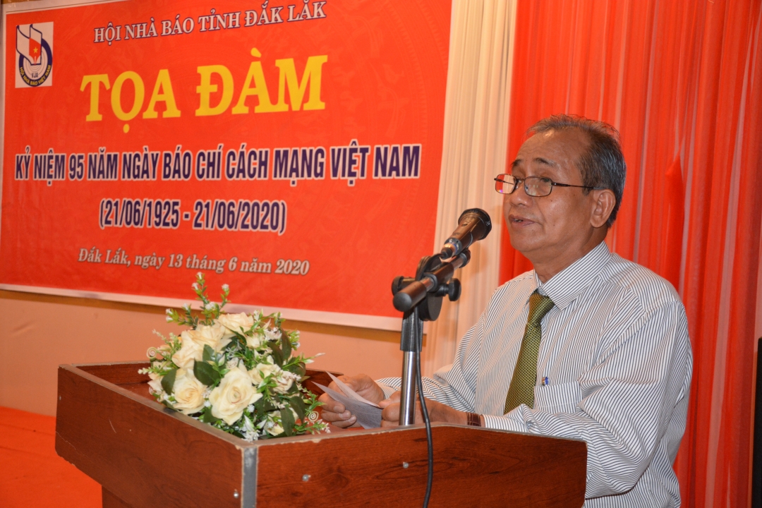 | Đồng chí Y Tuin Kmăn, Chủ tịch Hội Nhà báo tỉnh ôn lại truyền thống 95 năm Ngày Báo chí cách mạnh Việt Nam. |