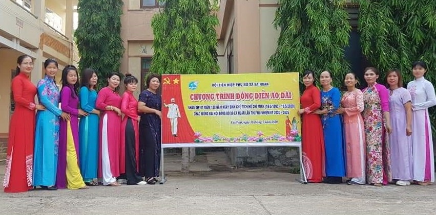 | Hội viên Hội Phụ nữ xã Ea Huar tích cực tham gia chương trình đồng diễn áo dài. |